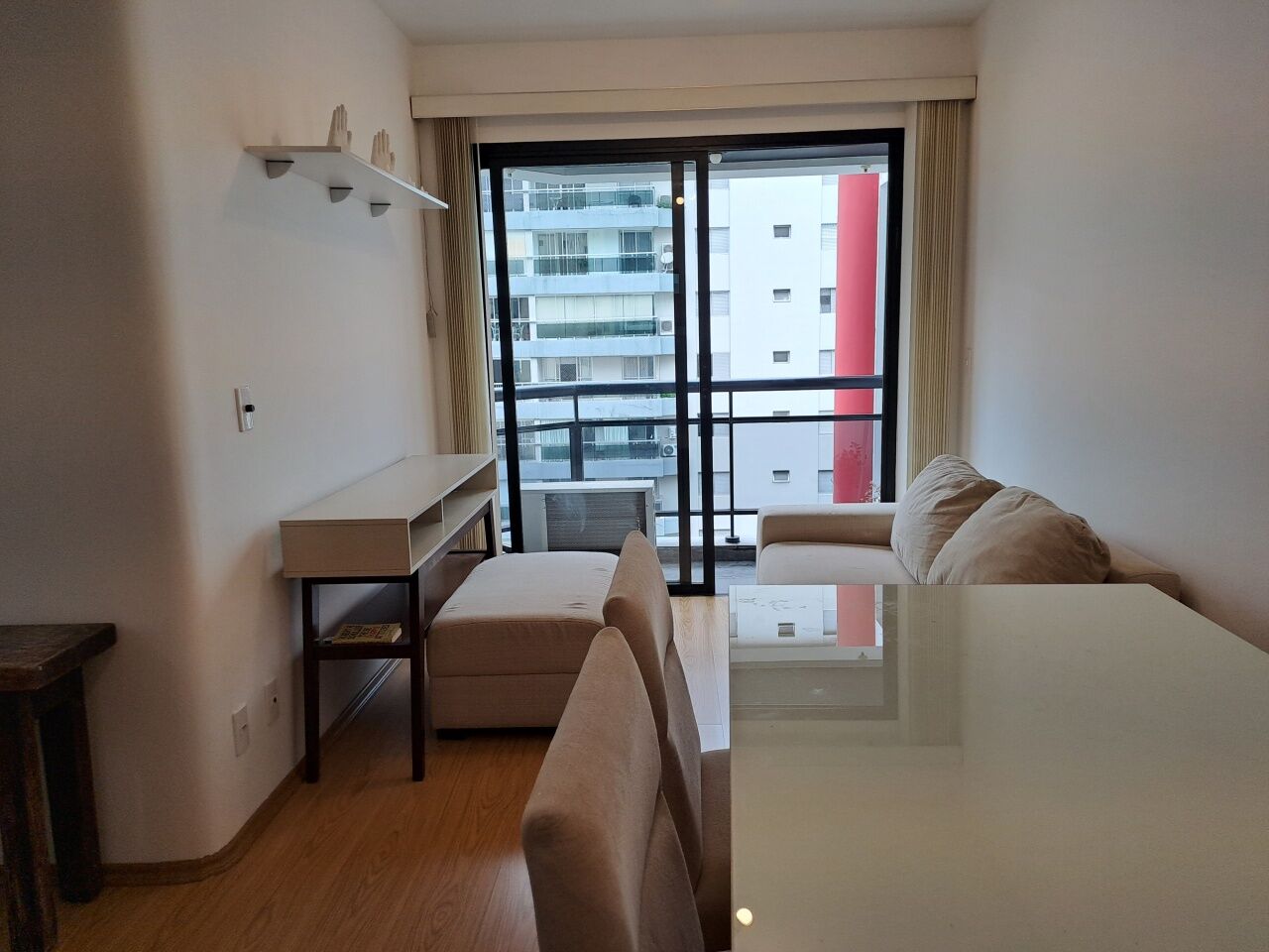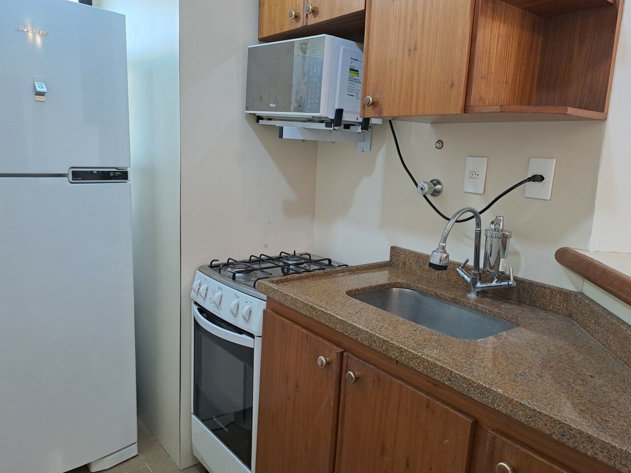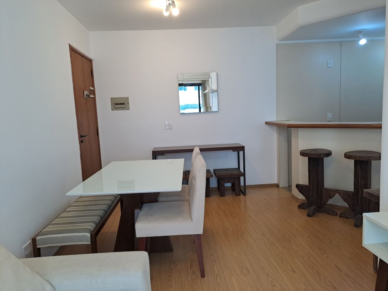 Apto. mobiliado, 39 m², 1 dormitório com ar condicionado, banheiro com chuveiro a gás, sala ampla com varanda, cozinha e 1 vaga de garagem.